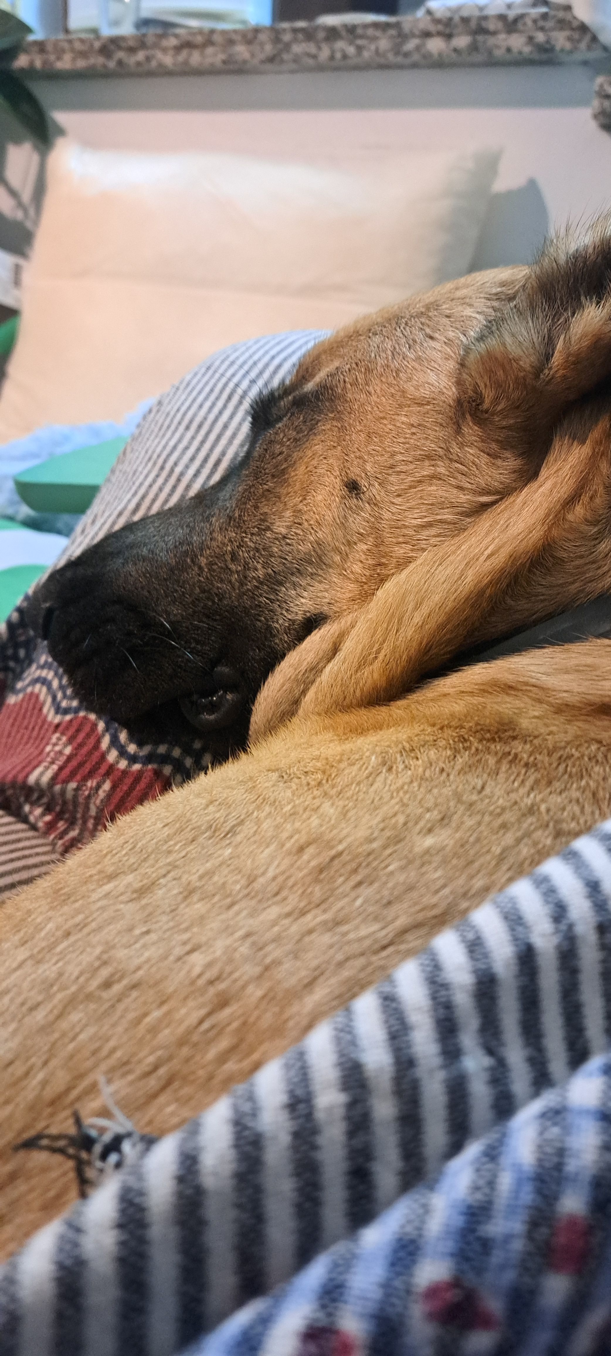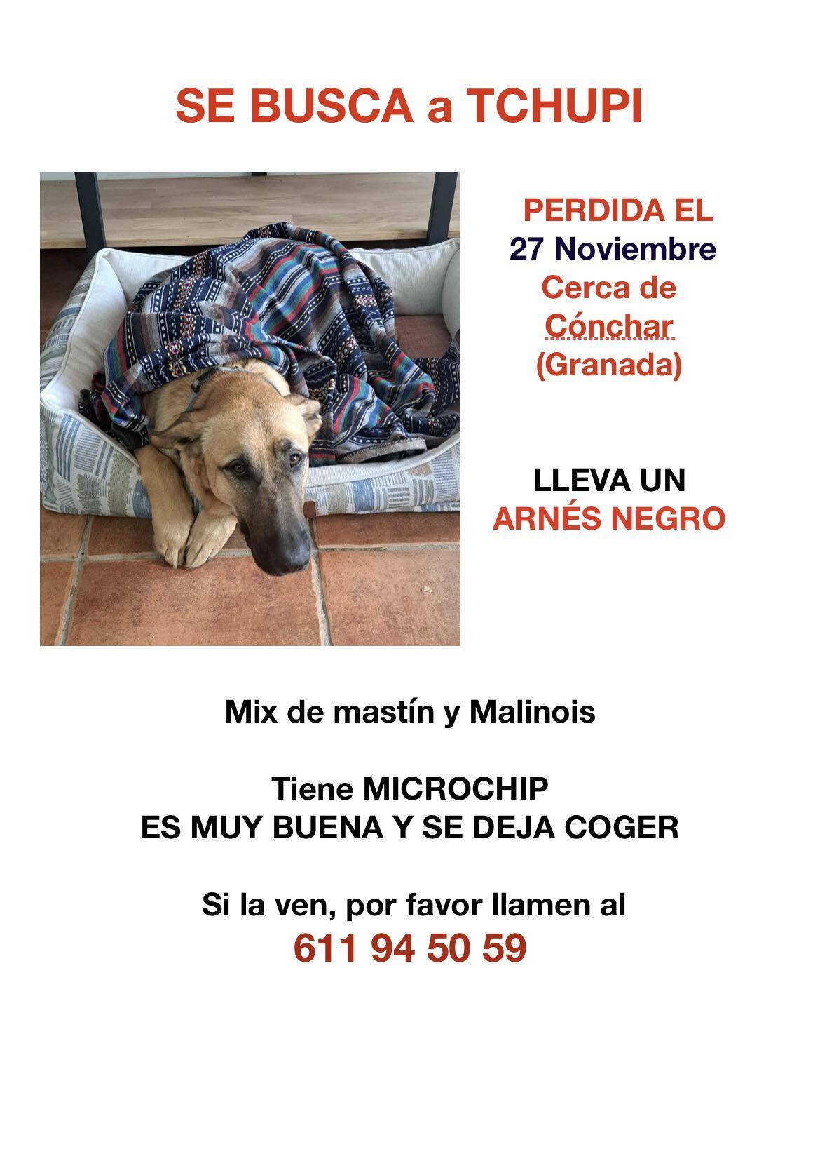 Es una perra mediana-grande mix malinois. Es muy dulce y conoce a su nombre y se deja coger. Tiene un collar verde-azul y un arnés negro. Lo queremos muchísimo.