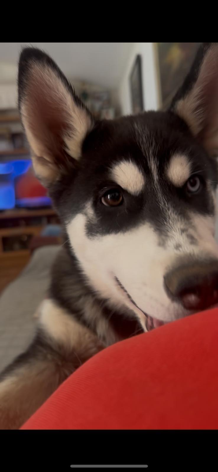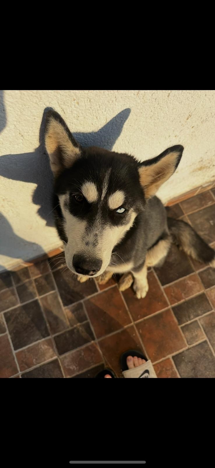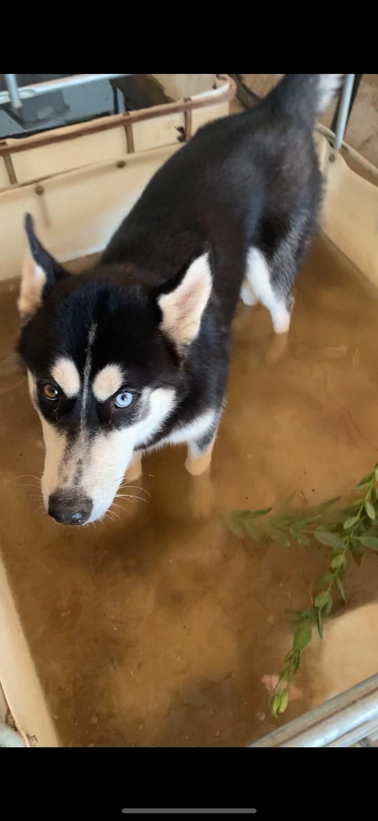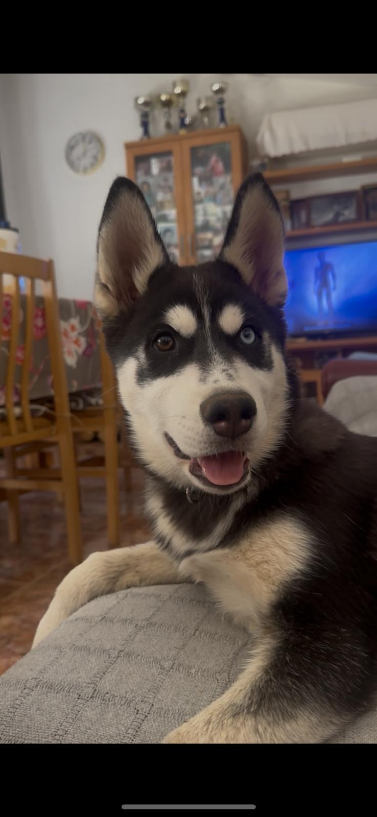 Es una perra husky súper cariñosa, súper lista, de tamaño mediano, color negro y blanco, un ojo de color claro y otro de color marrón, tiene chip y está denunciada.