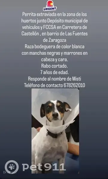 Se escapó en la zona de los huertos urbanos del depósito municipal de vehículos junto a la Ctra de Castellón en el barrio de Las Fuentes de Zaragoza. Raza bodeguero de color blanco con manchas marrones y negras en cabeza y cara . Rabo cortado