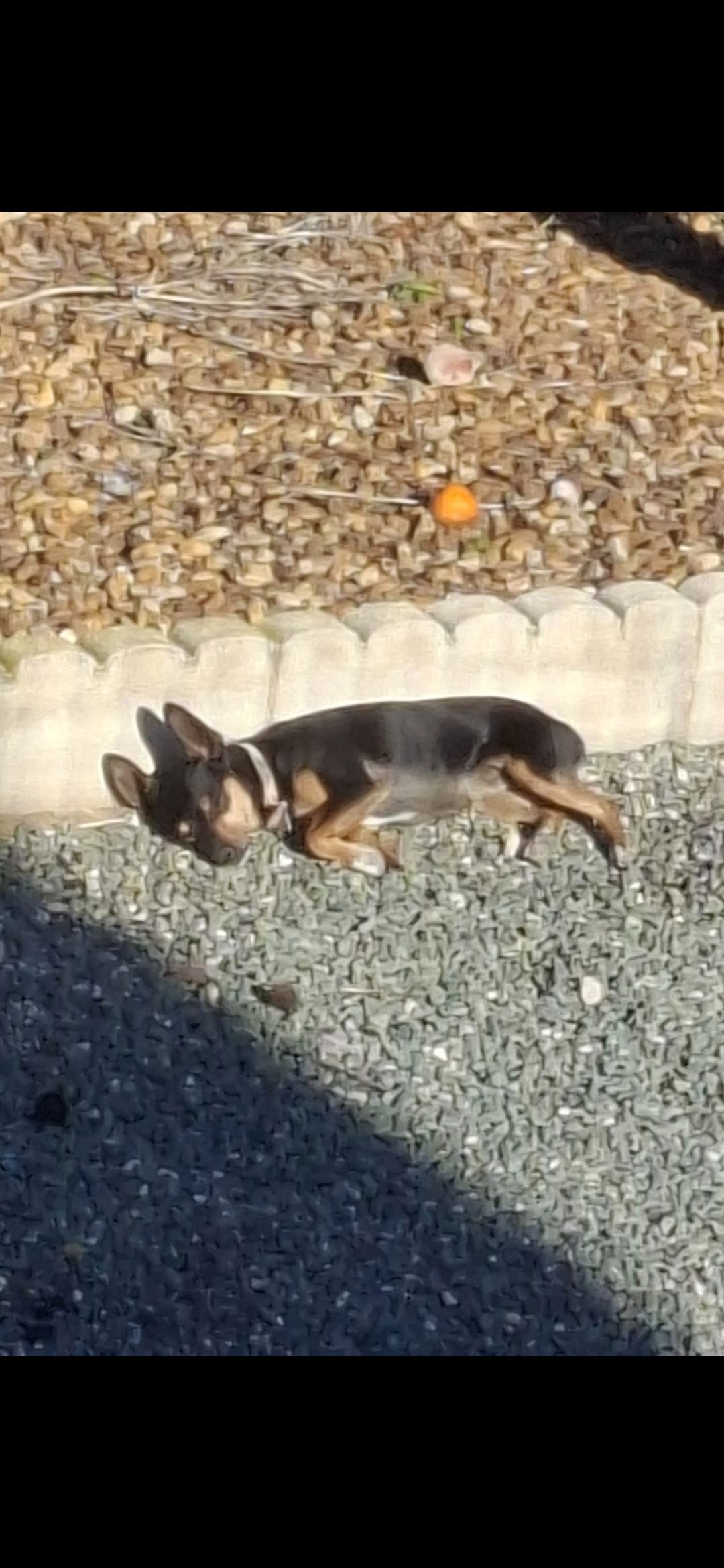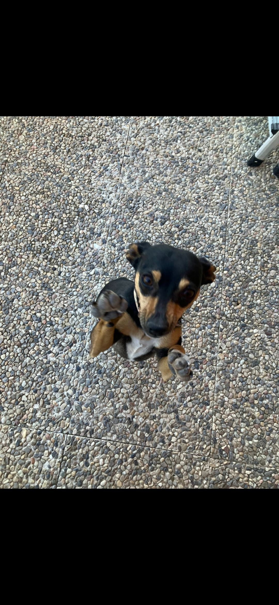 Mini pinscher hembra, lleva un collar con una placa en forma de hueso con su nombre, aunque puede que se lo haya quitado. Es de color negro y marrón con una mancha blanca en la barriga.