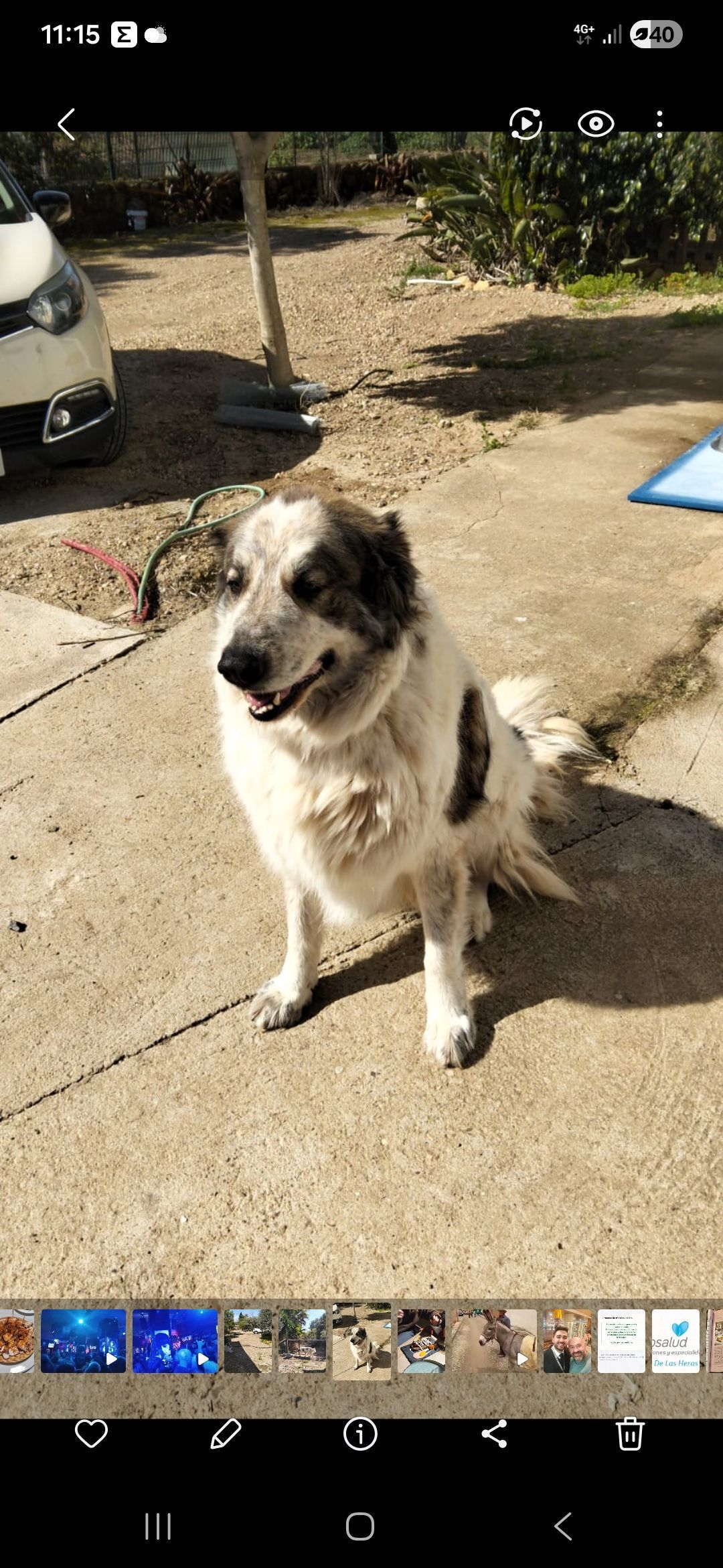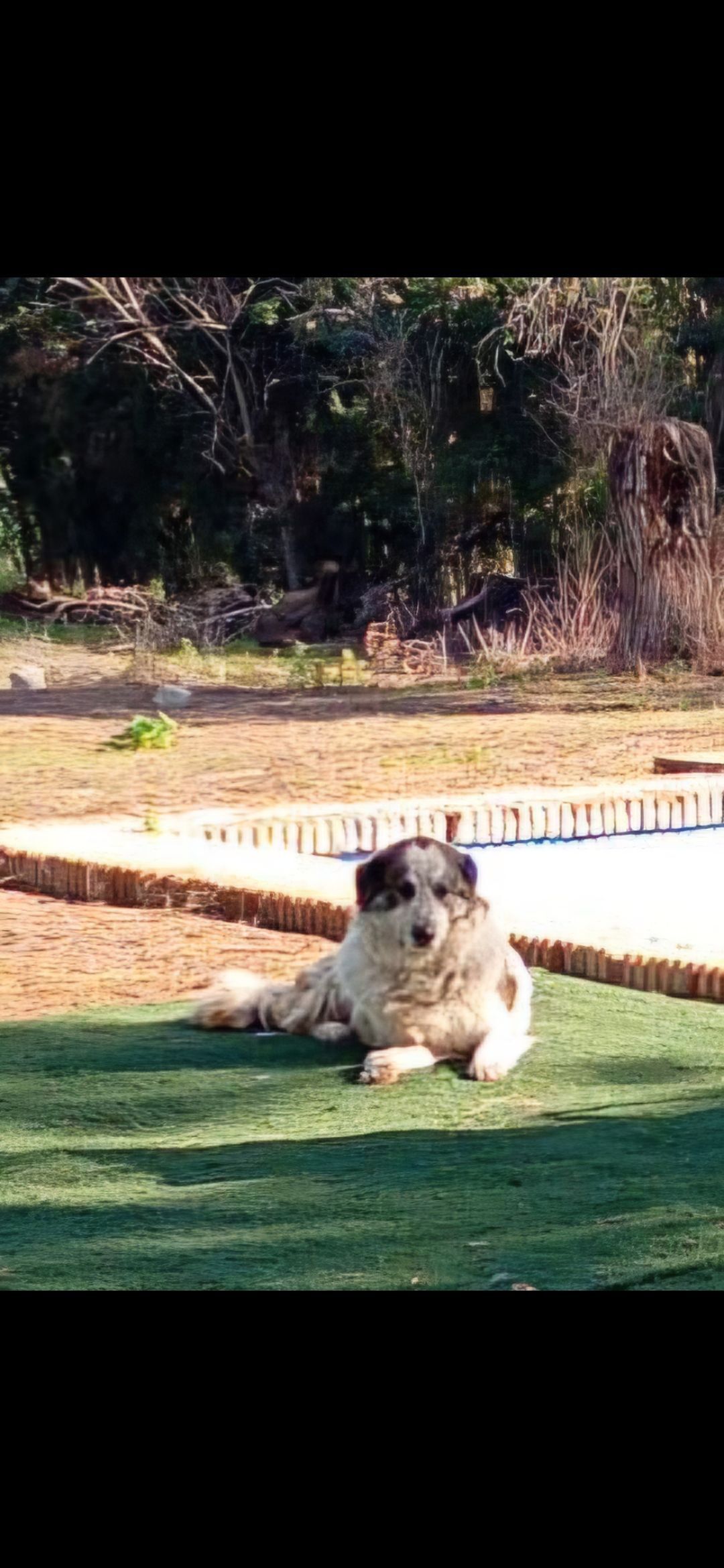 Es un mastín que responde al nombre de Río. Tiene pelo largo de color blanco con algunas manches marrones. Es de comportamiento amable. Le gusta bañarse en las orilla de los ríos. Se ha perdido acompañado de nuestro labrador de color marrón llamado Brownie.