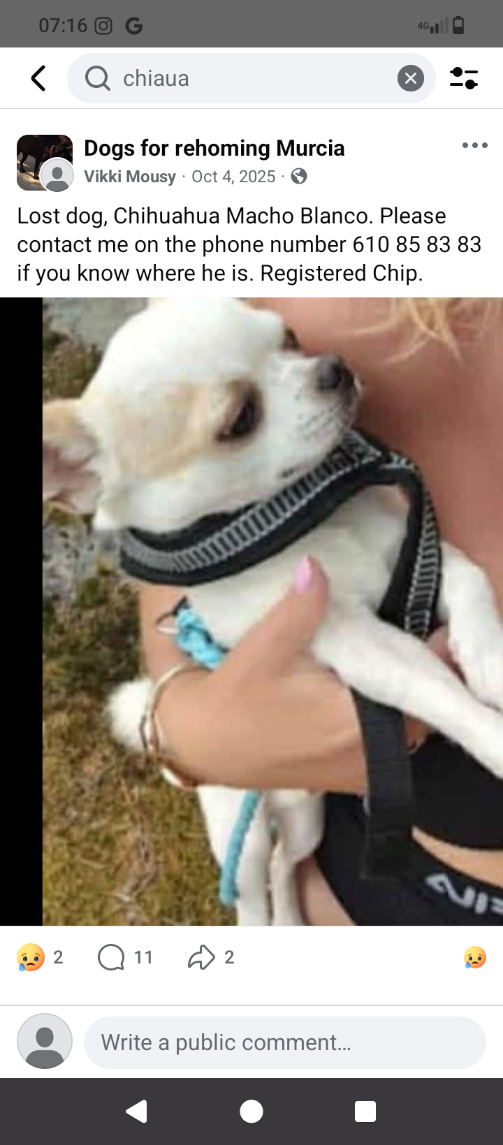 Los Alcazares, chiauaua edición grande, con pequeña mancha beige en la espalda, sin castrar, muy sociable con otros perros. Por favor, contacte si sabe algo, lo extrañamos mucho. +34 602703852 Victoria