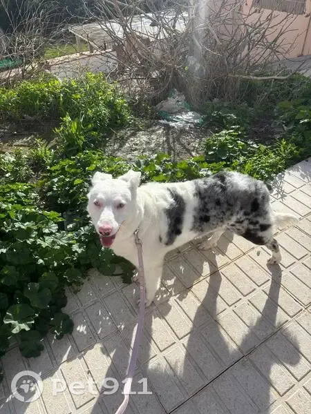 Es albina, tiene un ojo de cada color, de tamaño mediana, pelo blanco y negro por el lomo Creemos que La han robado de nuestra parcela porque han cortado la alambrada