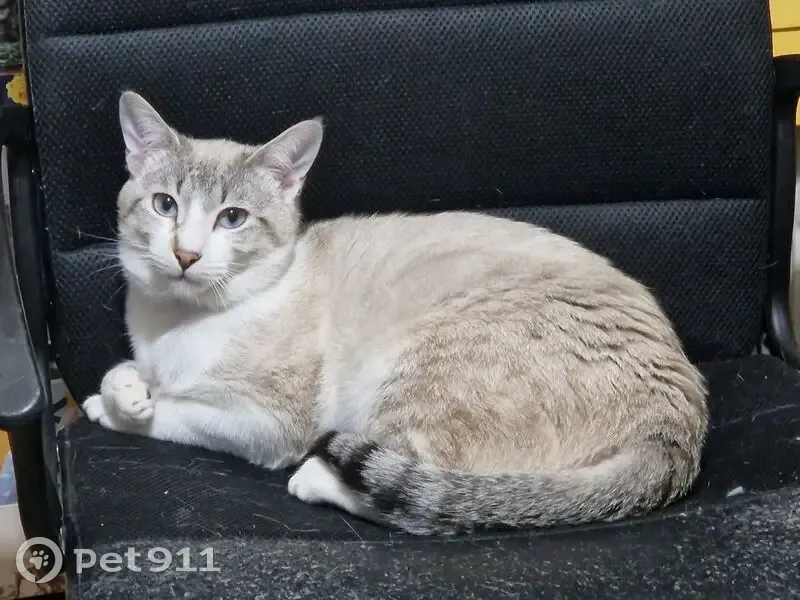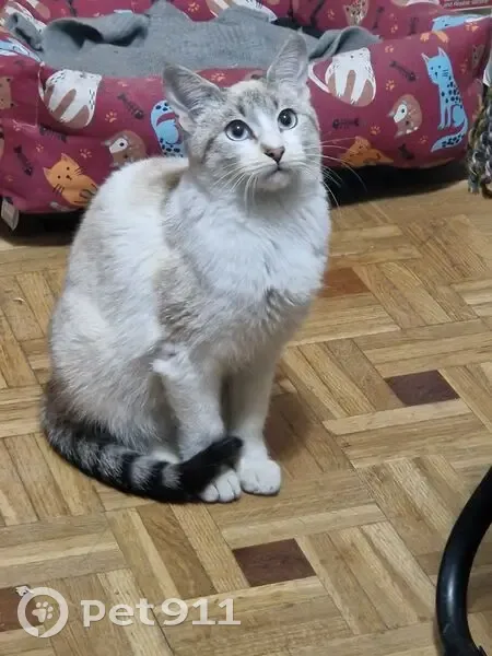Es blanco con tonos marrón claro, y cola gris anillado en negro, ojos azul claro, collar azul con identificación, castrado con chip, es cariñoso pero asustadizo