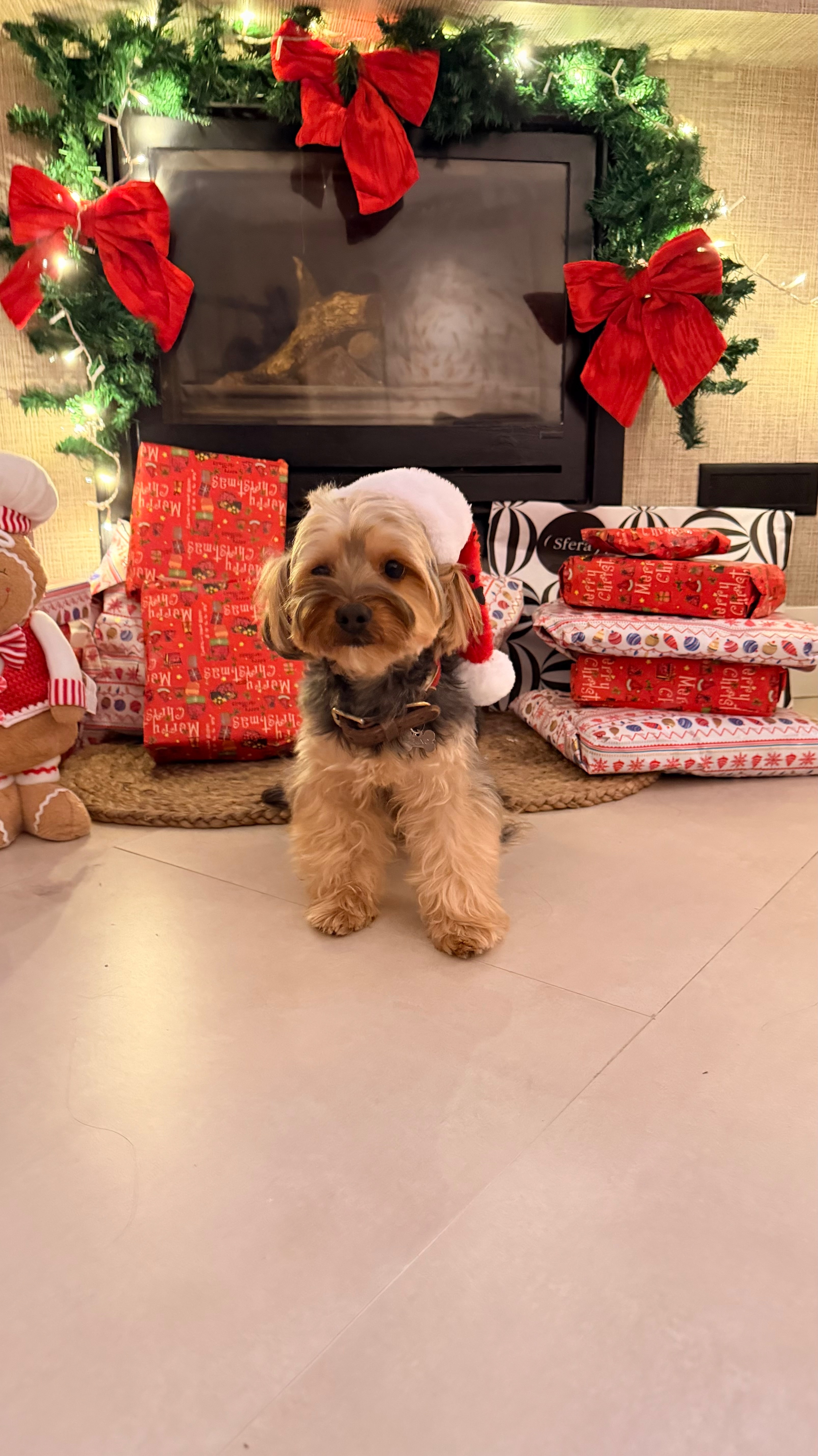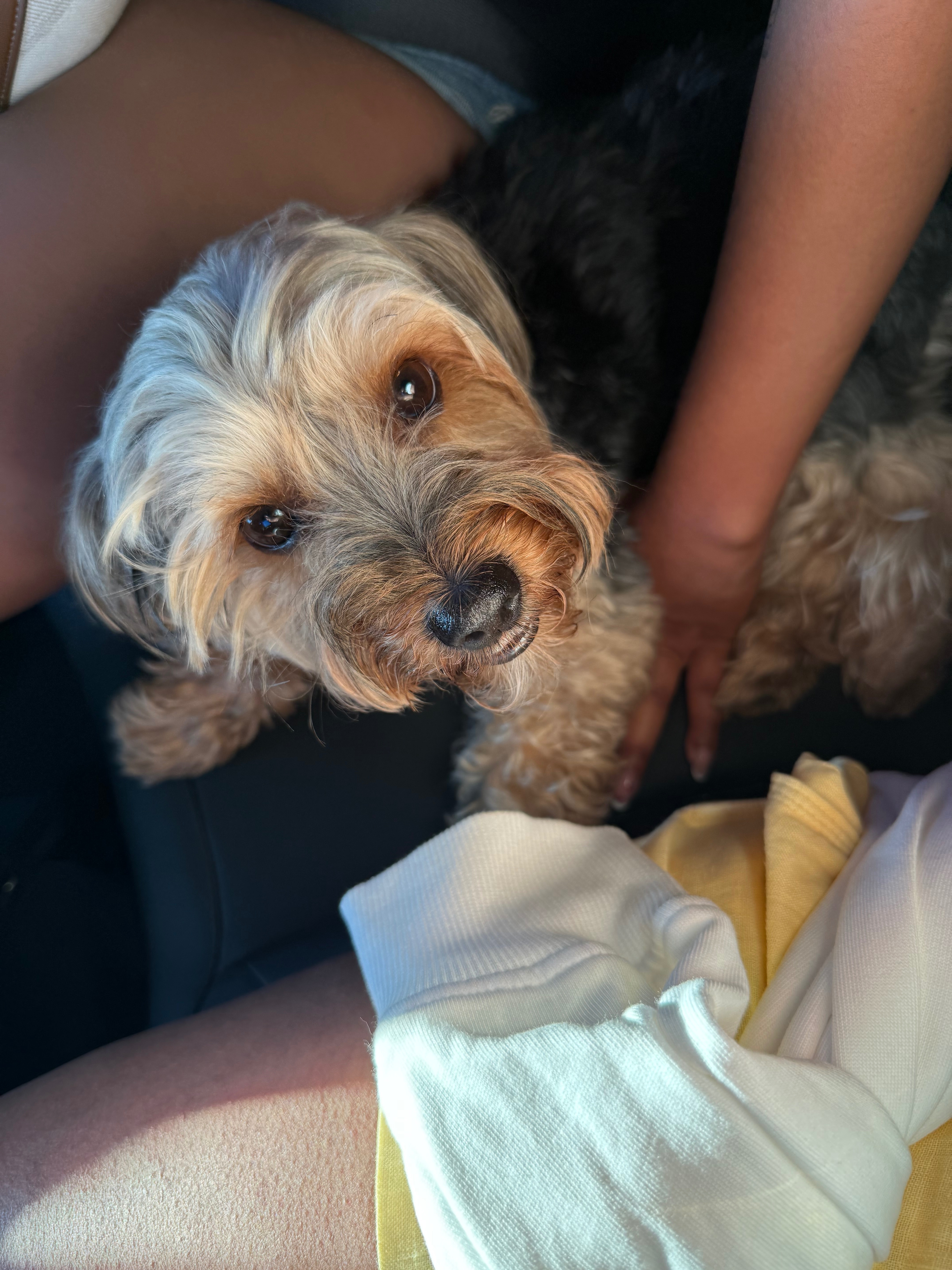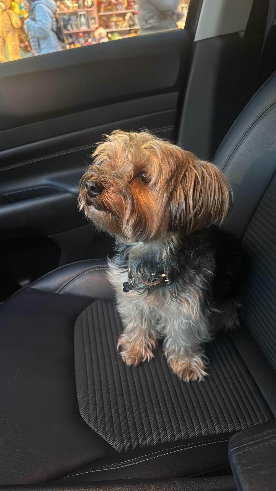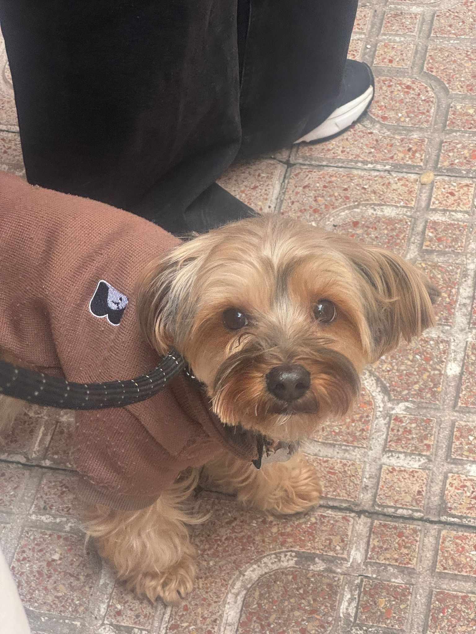 Negro con beige, color fuego, es un yorkishie mediano, tiene un collar vinotonto, se escapó por el garaje