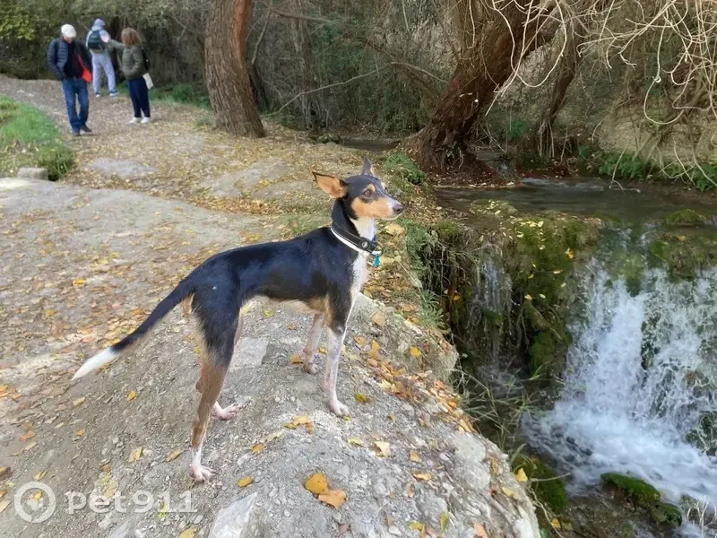 Es podenco, mestza, negra con una mancha blanca en el cuello y cola. Es asustó a y ayer en el paseo había algunos perros sueltos que se fueron hacia ella, se asustó y al tirar para atrás se le salió el collar.