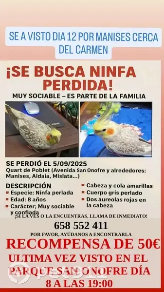 Es una ninfa perlada, con mofletes anaranjados o rojizos, con el cuerpo gris con puntos amarillos. Muy buena y sociable, se asustó con los petardos de las fiestas locales de Quart de Poblet. Vista cerca del hospital de Manises.