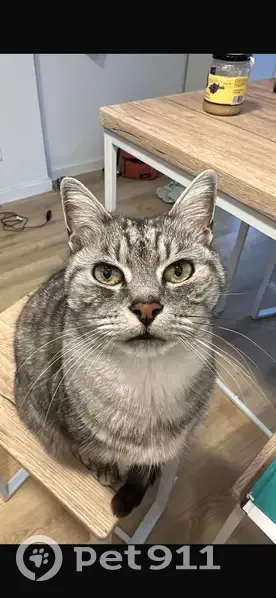 Es un gato macho de tamaño mediano, pelaje gris plateado atigrado con rayas oscuras, y una larga en la espalda. Tiene el pecho claro, ojos verde claro y nariz roja oscura. Es bastante delgado. Muy bueno. Tiene 14 años. Salió de casa y no volvió. Primera vez que pasa esto. Tiene chip registrado a mi nombre