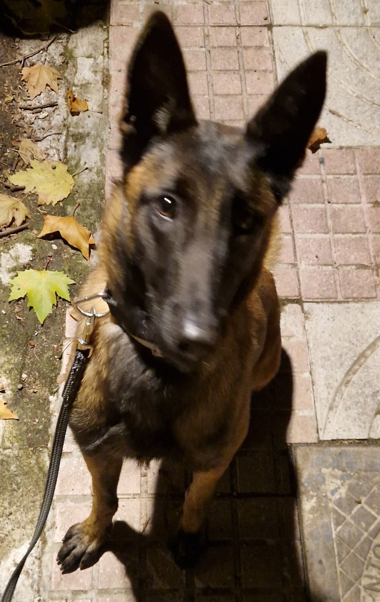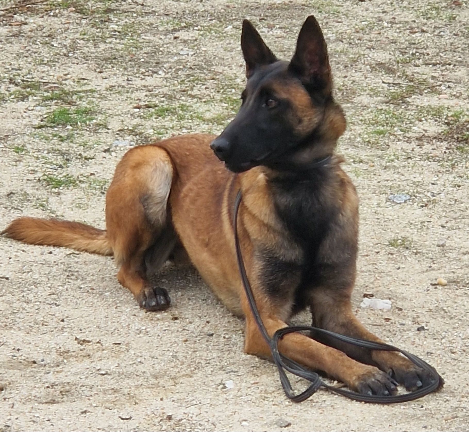 Pastor belga malinois de color marrón y cara y orejas negras. Tiene 2 años y medio, esta esterilizada.Muy esbelta de tamaño mediano grande Muy educada pero asustadiza