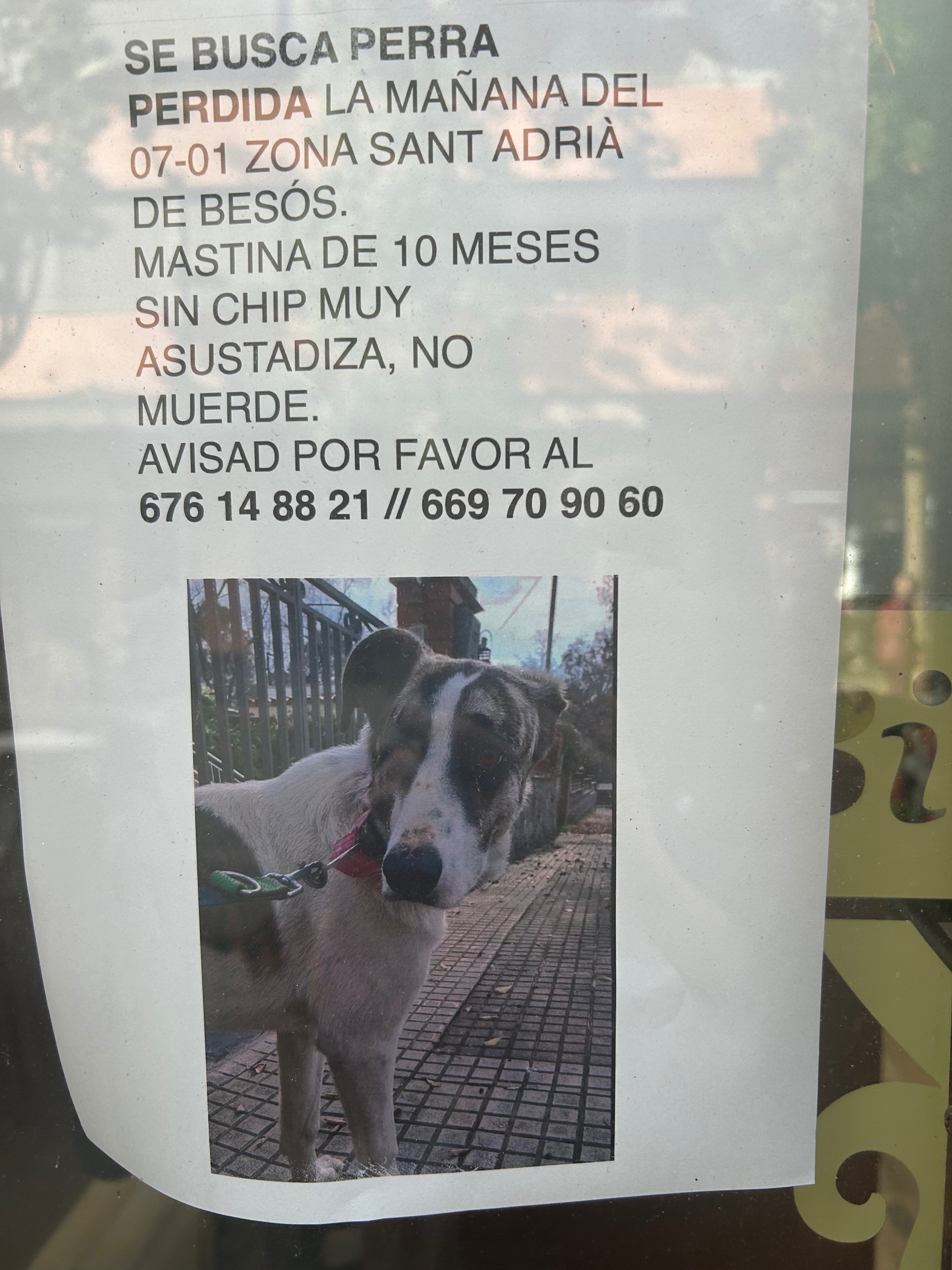 Hembra alta 10 meses asustadiza se escapó por el extensible que se escapó dela mano golpeó y se asustó mucho ya que iba colgando llevaba el arnés de la foto rosa que pone el nombre BRANDY