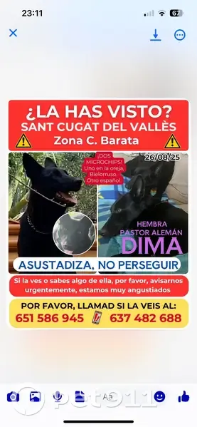 Por favor comparte con tus grupos y contactos Buscamos a Dima Se perdió en Can Barata. Sant Gugat del Vallès Se perdió el 2025-08-26 Perdida hembra pastor alemán negro. Es cariñosa y muy tímida. Nació en Bielorrusia, tiene 2 chip, uno Bielorruso, el otro de España con el 643099001566212 Cualquier información ayuda: Por favor llama a Valentina al 637482688,651586945 o envíanos un mensaje. - Revisa tus espacios cerrados con llave. - #Perroperdido #buscandoaDima