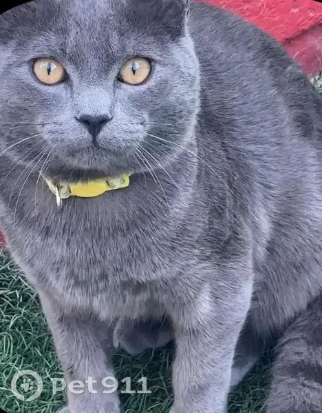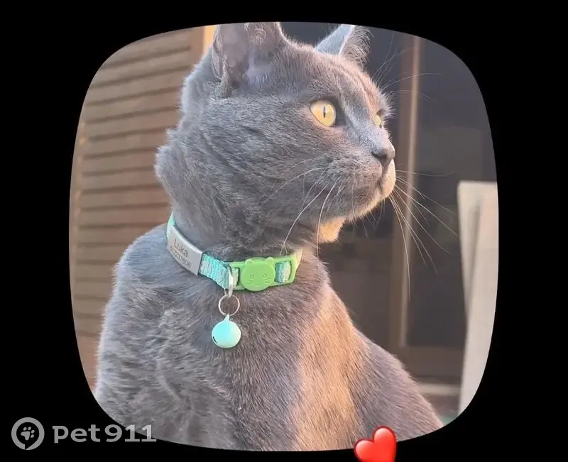 Es un gato macho Color gris oscuro parece un gato ruso, con collar azul que tiene puesto su nombre y mi número de teléfono, suele tener miedo, reconoce su nombre se llama luka,