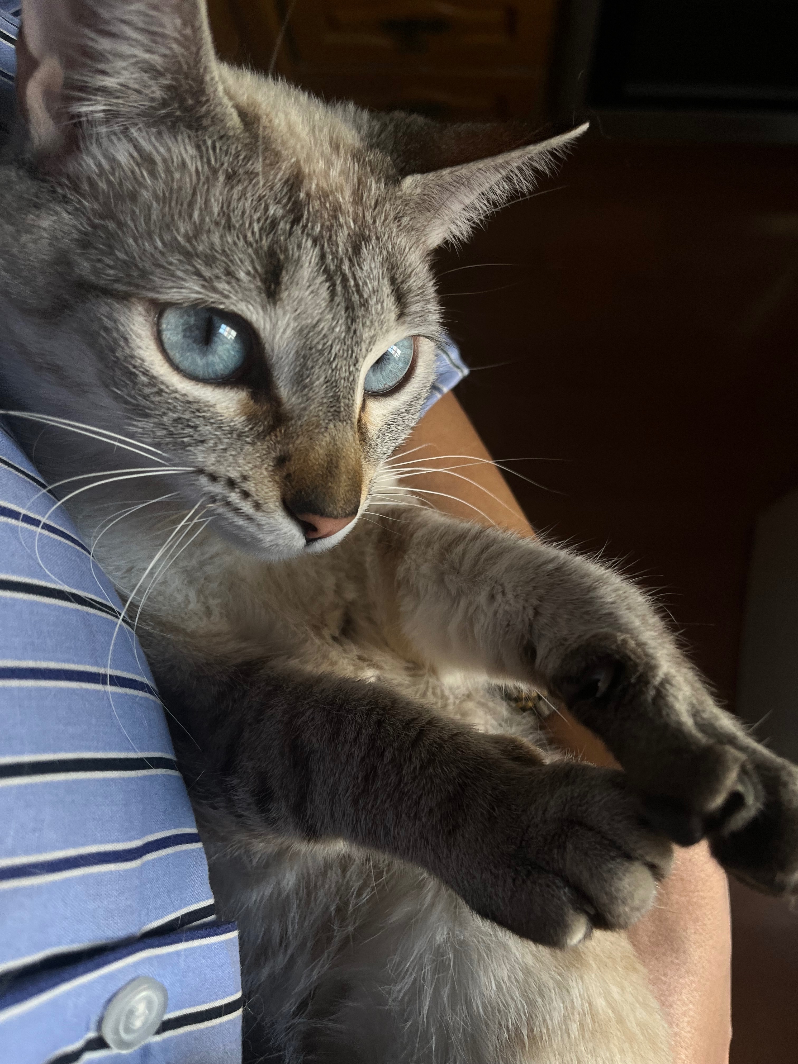 Su nombre es Sira y tiene 2 años, ojos azules, blanca y atigrada. Es muy asustadiza y casi no maúlla. No se deja coger fácilmente. Llevaba collar cuando desapareció. Cayó de unos 4 o 5 metros de altura y no sé si estará herida. No lleva chip