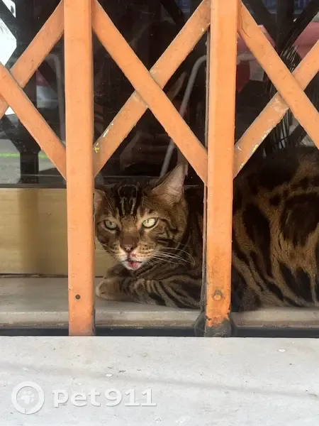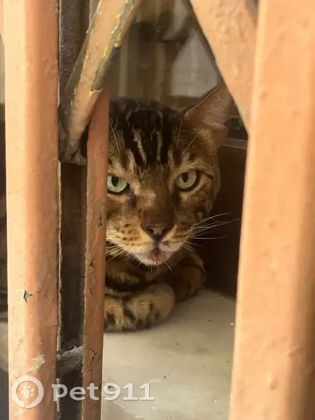Parece gato bengalí, creemos que macho, ojos verdes y tiene una pequeña herida en la barbilla, se ve en las fotos