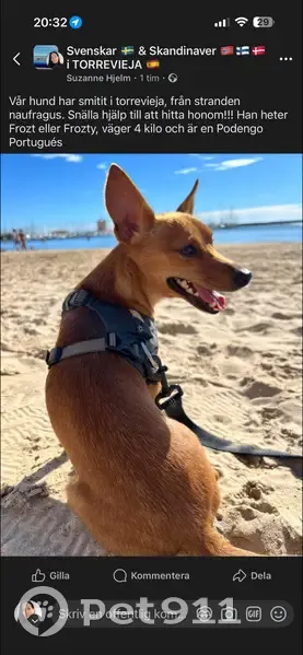 PERRO PERDIDO / PERRO DESAPARECIDO Nombre: Frozt (también llamado Frozty) Raza: Podenco Portugués Pequeño Liso Peso: 4 kilos Descripción física: • Pelaje corto y liso de color marrón rojizo/canela • Orejas grandes y erguidas, muy expresivas • Hocico estrecho y elegante • Constitución delgada y atlética • Tamaño pequeño • Apariencia similar a un zorro pequeño Última vez visto: En la playa de Los Náufragos, Torrevieja Características distintivas: • Perro de raza Podenco Portugués Pequeño Liso • Muy ágil y rápido • Llevaba un arnés de color azul/gris oscuro Contacto: [Añade aquí tu número de teléfono y/o email] SE OFRECE RECOMPENSA Por favor, si alguien ha visto a este perro o tiene información, contacte inmediatamente. Es muy importante para nosotros encontrarlo. ¡AYÚDANOS A ENCONTRAR A FROZT!