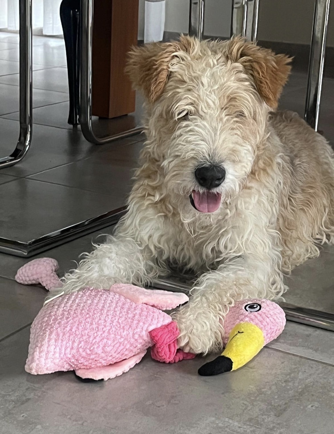 Fox Terrier que responde al nombre de Terry muy cariñoso y sociable. Tiene bastante pelo rizado beige con alguna mancha marrón y negra. Lleva collar rojo y otro antiparásitos. Es posible que esté asustado por el viento. Tiene chip. Teléfono de contacto: 629509494