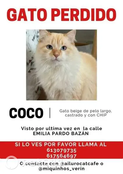 Es un gatito beige muy clarito con el pelo largo , es muy asustadizo ,TIENE CHIP llevo toda la noche buscándolo por los alrededores de emilia pardo bazan , por favor si alguien lo ve que me llame al 613079735
